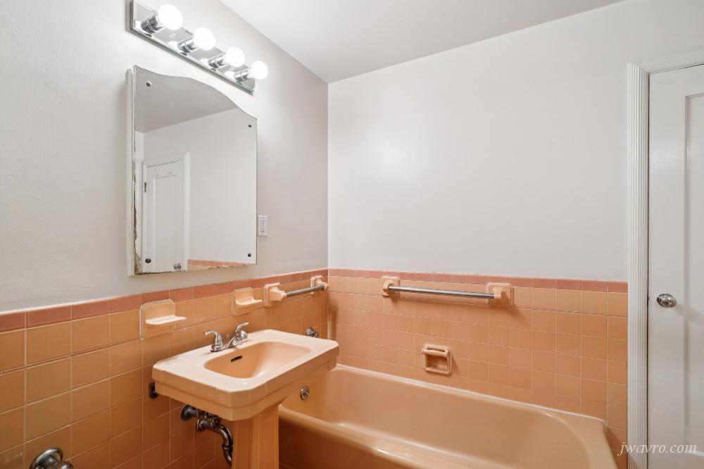 ~ Art deco bathroom with a pedestal sink and separate soaking tub and walk-in shower