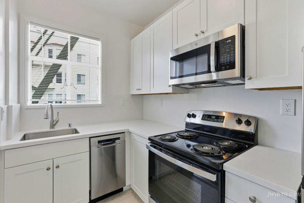 ~ Remodeled kitchen with stainless steel appliances featuring a gas stove, dishwasher and microwave