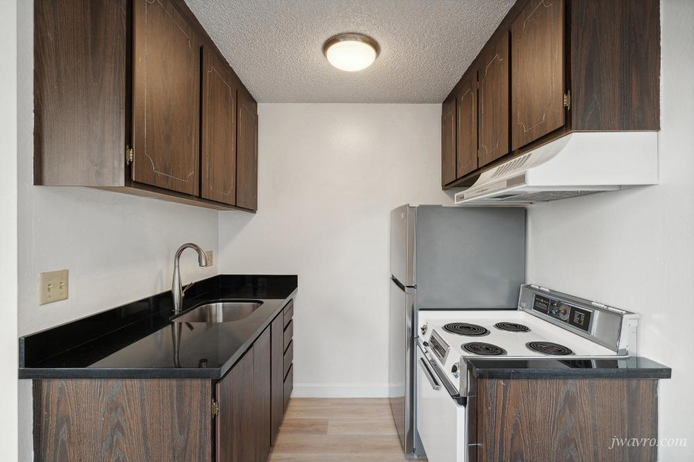 ~ Kitchen with electric stove, refrigerator with a separate dining nook