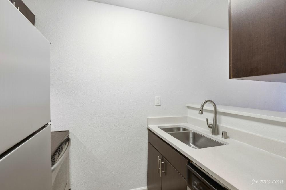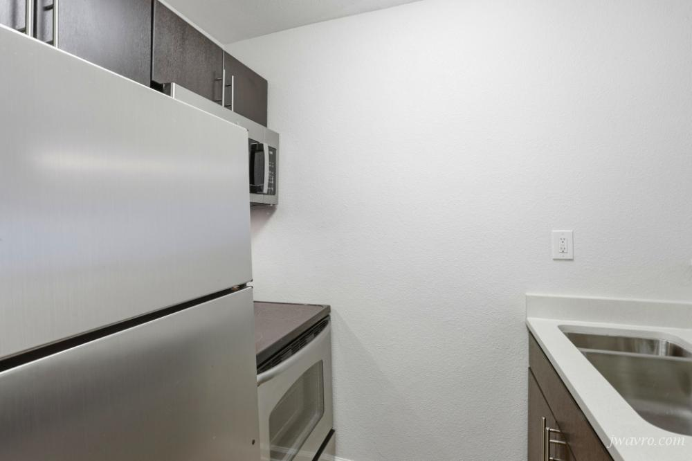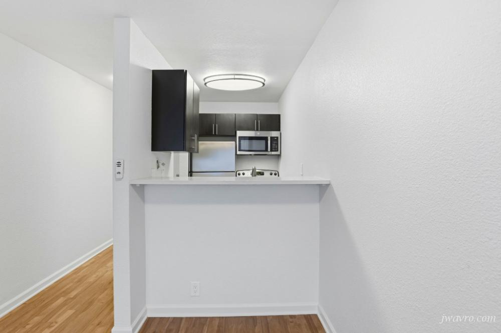 ~ Remodeled galley kitchen with stainless steel appliances including dishwasher and built-in microwave