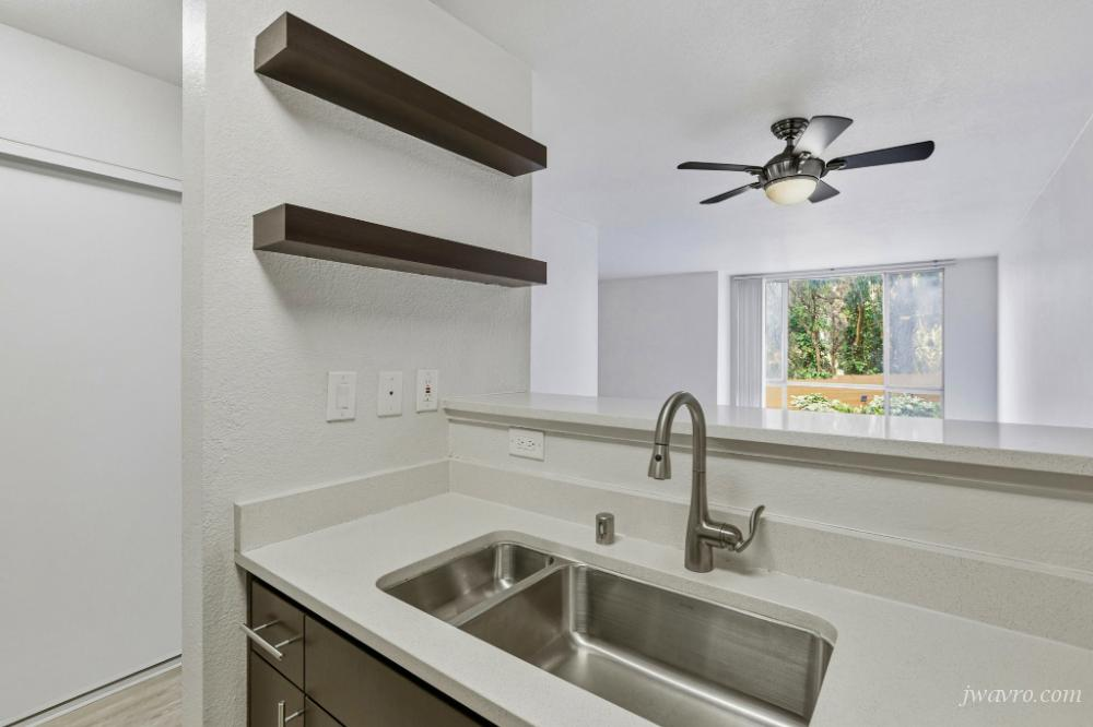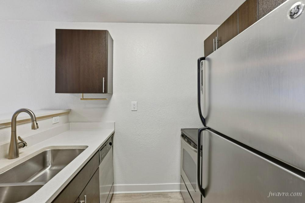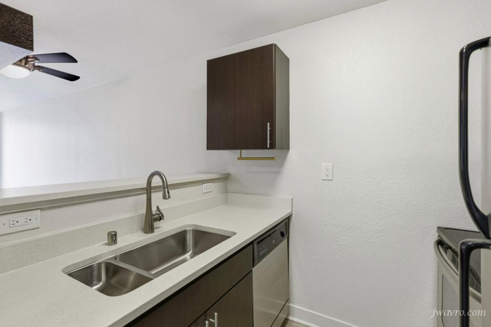 ~ Remodeled galley kitchen with stainless steel appliances including dishwasher and built-in microwave